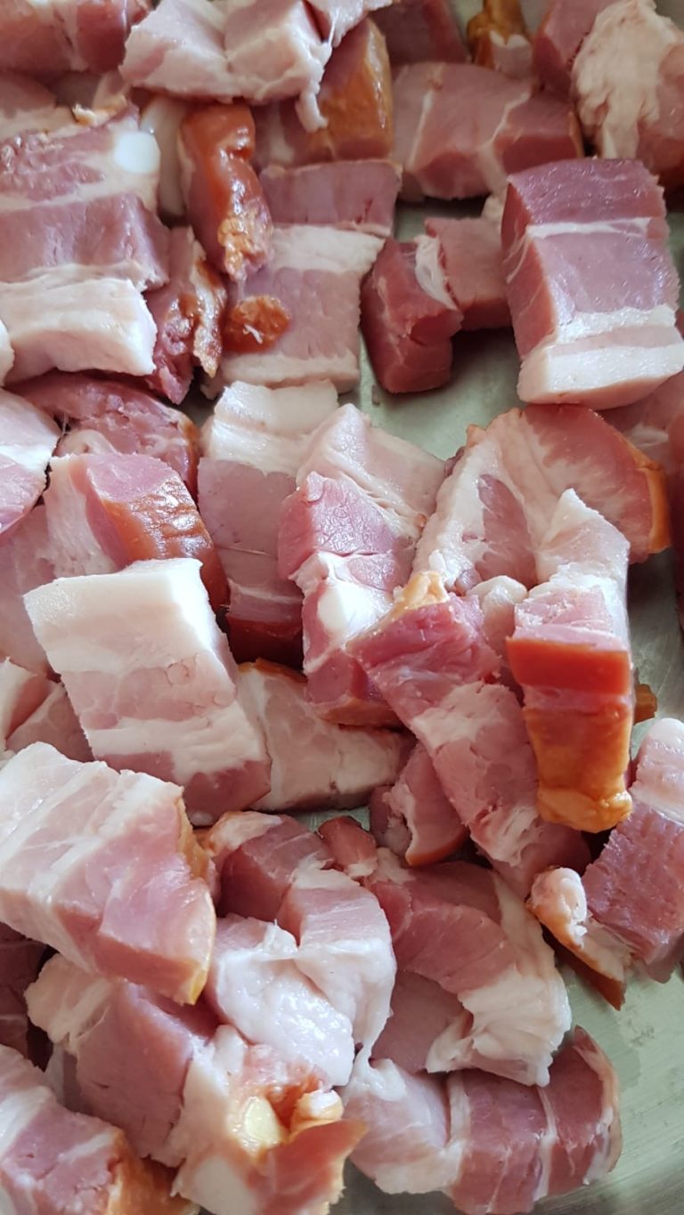 - Den Bauchspeck von der Schwarte befreien und in circa 1,5 cm breite Würfel schneiden.
