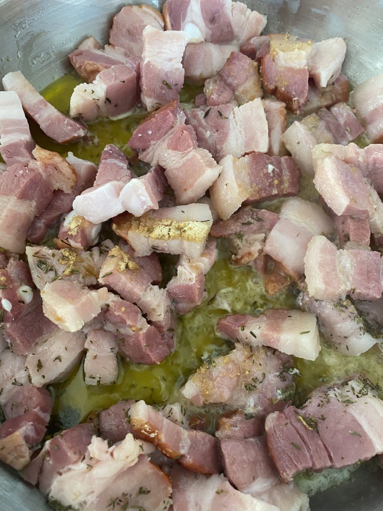 - Den Bauchspeck in eine Pfanne geben, das Olivenöl und die Butter hinzugeben sowie den ganzen Thymian und knusprig goldbraun braten.Aber nicht zu heiß werden lassen – er verbrennt leicht