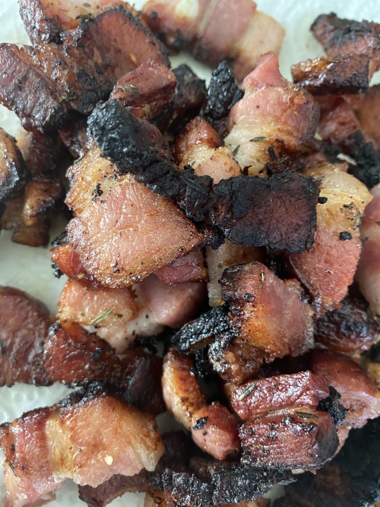 - Den Bauchspeck auf einem Küchentuch abtropfen lassenabtropfen lassen